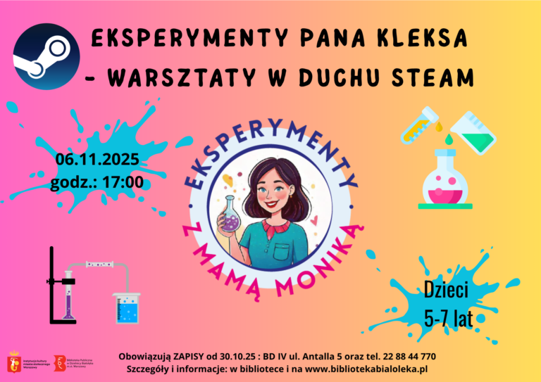 Biblioteka dla Dzieci i Młodzieży numer IV zaprasza serdecznie wszystkie dzieci w wieku 5-7 lat na Eksperymenty Pana Kleksa prowadzone przez @EksperymentyzmamąMoniką.