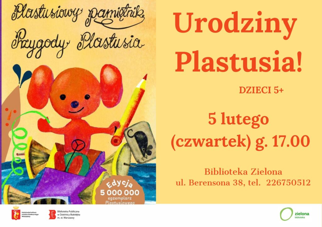 Biblioteka Zielona zaprasza dzieci i rodziców na Urodziny Plastusia, które odbędą się 5 lutego, godz. 17. Ten niezwykły mały plastelinowy ludzik z bardzo dużymi uszami, który mieszkał w piórniku Tosi, obchodzi 90 urodziny! Z tej okazji spotykamy się w Zielonej na warsztatach, na których będziemy bawić się razem z Plastusiem, zrobimy własne Plastusie, sprawdzimy, do czego służy piórnik i czy można go zrobić samemu. Będą zagadki, tańce i dużo plasteliny! Ogłosimy też konkurs związany z jubilatem. Na wydarzenie obowiązują zapisy pod nr. tel. 22 675 05 12.