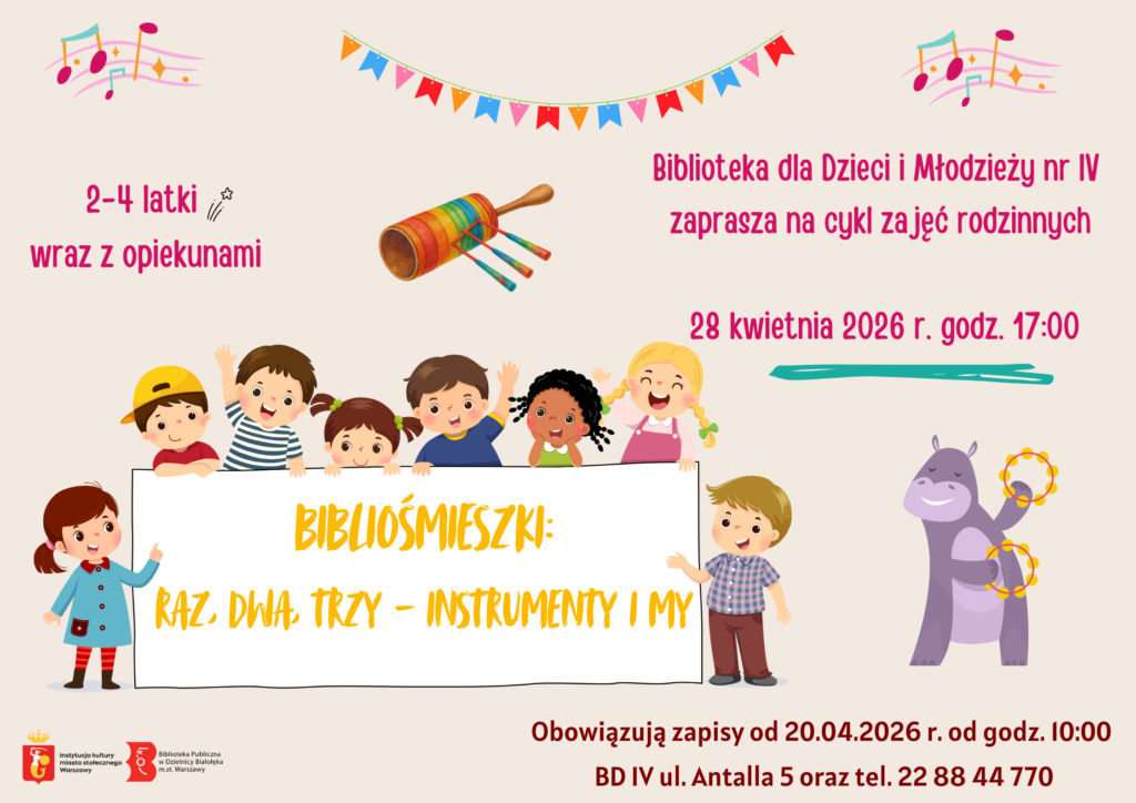 Biblioteka dla Dzieci i Młodzieży nr IV (ul. Antalla 5) zaprasza28 kwietnia o godz. 17.00dzieci w wieku 2-4 lata wraz z opiekunami na Bibliośmieszki. Tym razem będziemy odkrywać świat instrumentów. Posłuchamy ich dźwięków, spróbujemy na nich zagrać i stworzymy wspólną, radosną orkiestrę.
