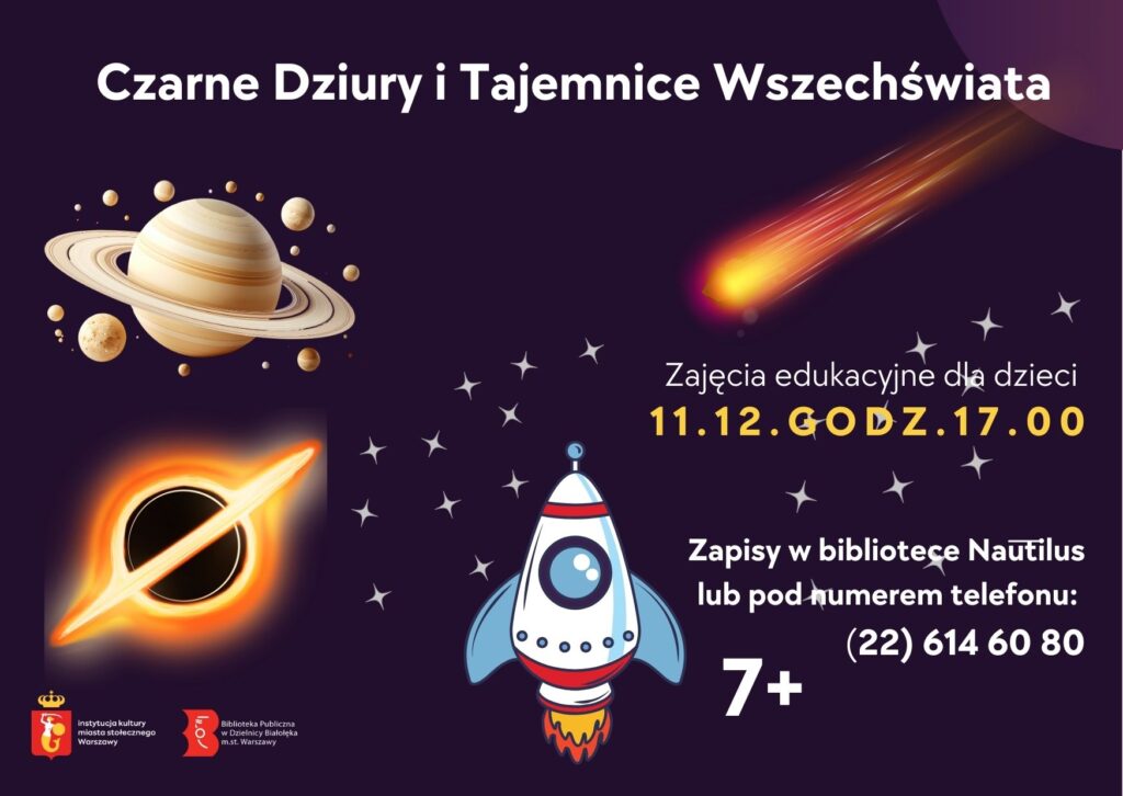 W dniu 11.12.2025 r. o godzinie 17:00 w bibliotece Nautilus odbędą się zajęcia edukacyjne pt. Czarne dziury i tajemnice Wszechświata.