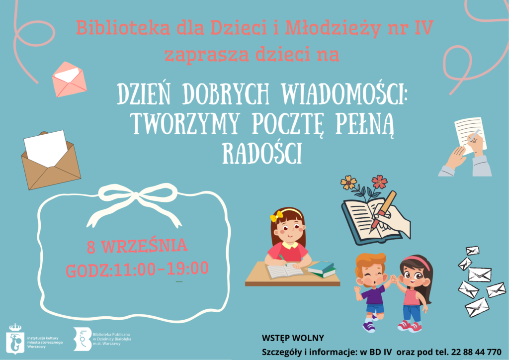 Z okazjiDnia Dobrych Wiadomościzapraszamy wszystkich do wspólnego tworzeniapoczty pełnej uśmiechu i pozytywnych słów! 8 września w godzinach od 11:00-19:00 w Czwórce każdy chętny wykona własną kartkę z miłymi słowami. Następnie one do innych osób, żeby wywołać uśmiech na ich twarzach. Twoja kartka może być początkiem czyjegoś pięknego dnia! 🙂