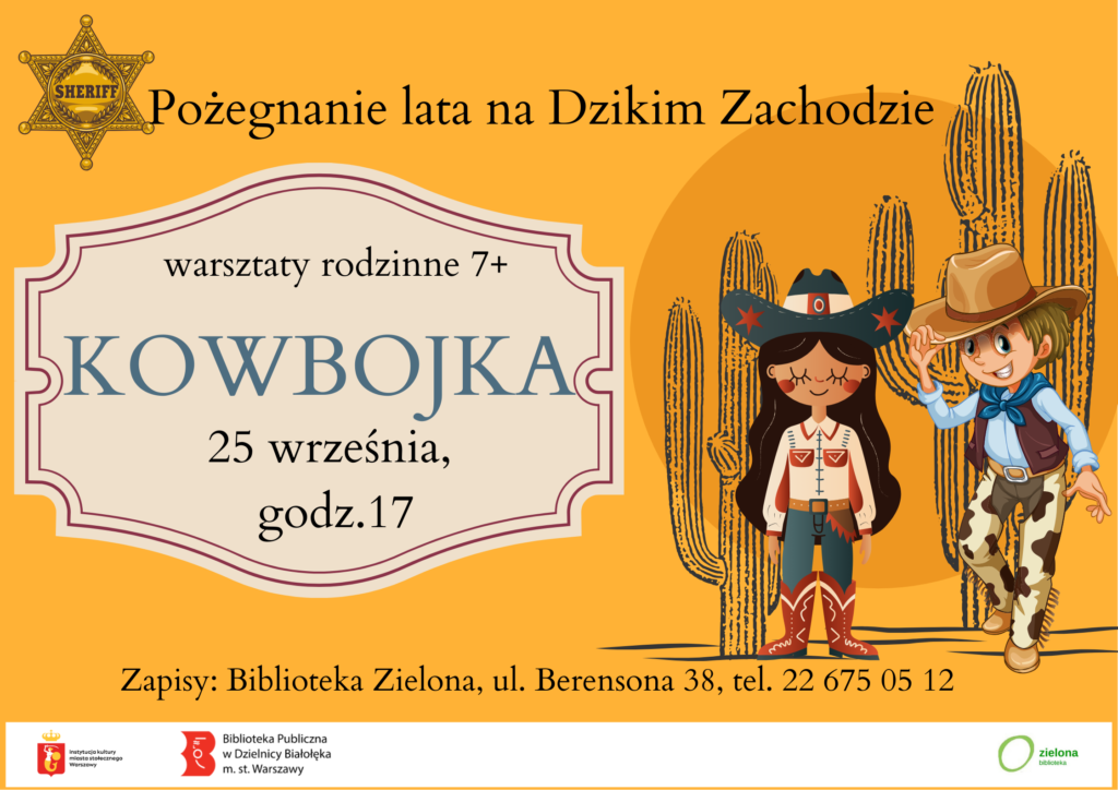 Zapraszamy dzieci i rodziców na warsztaty w kowbojskim klimacie – 25 września (godz. 17) będziemy żegnać lato na Dzikim Zachodzie! W programie różne zabawy i aktywności, a także prace manualne i czytanie książek w kowbojskim duchu.. Na koniec nauczymy się tańczyć kowbojkę! Mile widziane kowbojskie akcenty w stroju. Obowiązują zapisy.