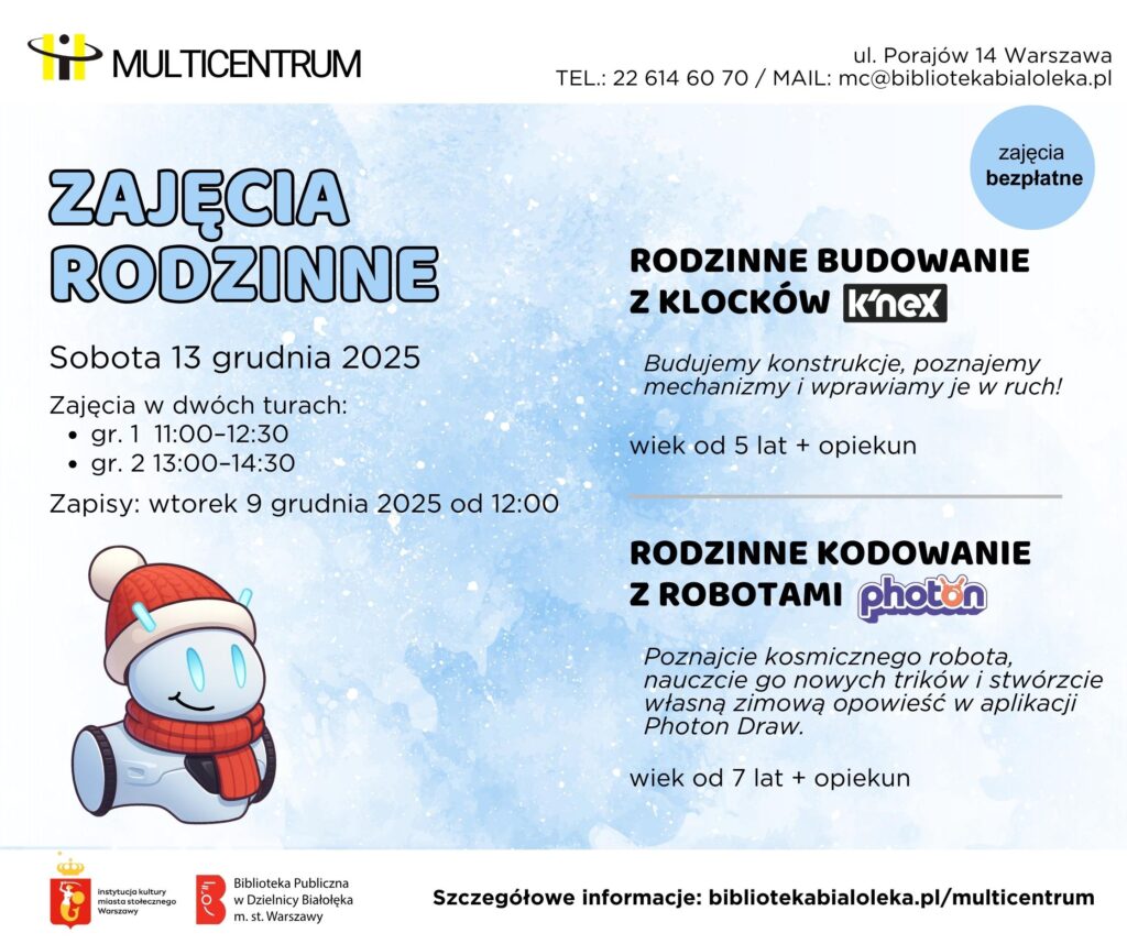 🖍️ Wstęp: bezpłatny, obowiązują zapisy 📞tel. 22 614 60 70 lub ✉️e-mail mc@bibliotekabialoleka.pl