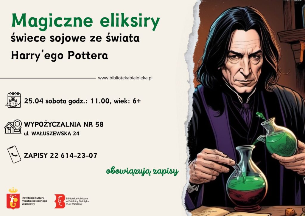 Wypożyczalnia Nr 58 zaprasza na warsztaty tworzenia świec sojowych, których inspiracją będą słynne eliksiry profesora Severusa Snape’a. Spotkanie odbędzie się w sobotę 25 kwietnia o godzinie 11.00. Wiek 6+, obowiązują zpisy.