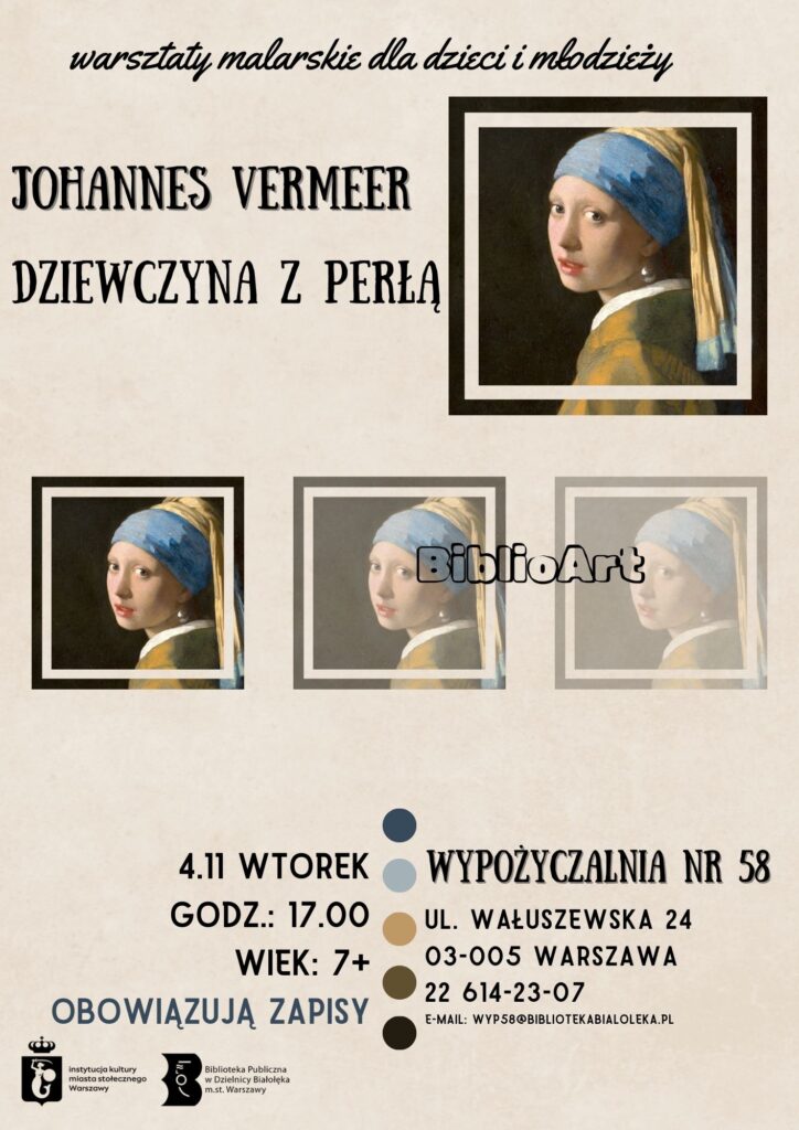 Zapewniamy wszystkie materiały i wspaniałą atmosferę. Na zajęciach tym razem poznamy arkana warsztatu Johannesa Vermeera i namalujemy – krok po kroku – Dziewczynę z perłą. Uwaga! Obowiązują zapisy.