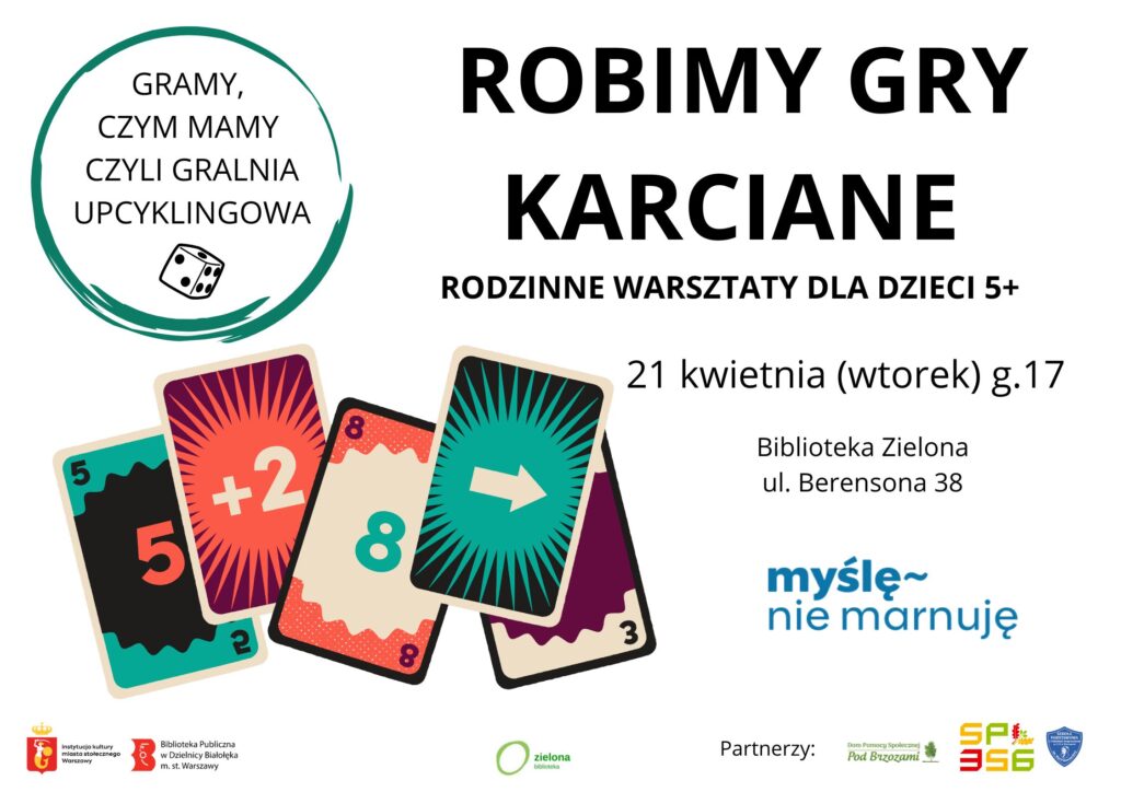 21 kwietnia o g. 17.00 zapraszamy do Biblioteki Zielonej wszystkich fanów gier i twórczej zabawy. Będziemy robić gry karciane z niepotrzebnych rzeczy. Tymi warsztatami zaczynamy w Bibliotece Zielonej projekt Gramy, czym mamy czyli gralnia upcyklingowa, który będzie realizowany w ramach warszawskich partnerstw na rzecz niemarnowania zasobów Myślę, nie marnuję. W ramach projektu będziemy robić oprócz karcianych także gry planszowe, paragrafowe, terenowe, zręcznościowe i inne. Zaczynamy od karcianek, wymyślimy zasady, przygotujemy karty i rozegramy zrobione przez siebie gry. Zapraszamy zespoły międzypokoleniowe – na zajęcia obowiązują zapisy.
