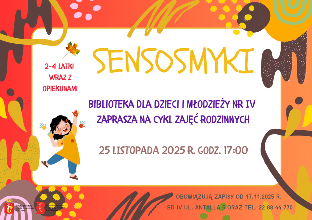 Biblioteka dla Dzieci i Młodzieży nr IV zaprasza dzieci w wieku 2-4 lata wraz z opiekunami na kolejne zajęcia z cyklu Sensosmyki. Jak zawsze, będziemy wspólnie odkrywać opowieść poprzez dotyk, dźwięk, ruch i zabawę.