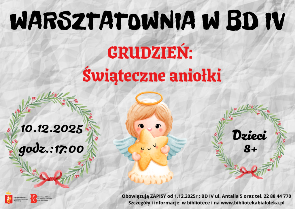 Macie ochotę stworzyć coś własnoręcznie, puścić wodze fantazji i dobrze się bawić? W grudniu (10.12.2025 o godz. 17:00) odbędą się kolejne warsztaty DIY w Bibliotece dla Dzieci i Młodzieży nr IV. Zapraszamy wszystkich miłośników rękodzieła i recyklingu do stworzenia świątecznego aniołka. Zajęcia przeznaczone dla dzieci w wieku 8+. Zapisy od 1.12.2025 w bibliotece i pod numerem telefonu 22 88 44 770, liczba miejsc ograniczona.