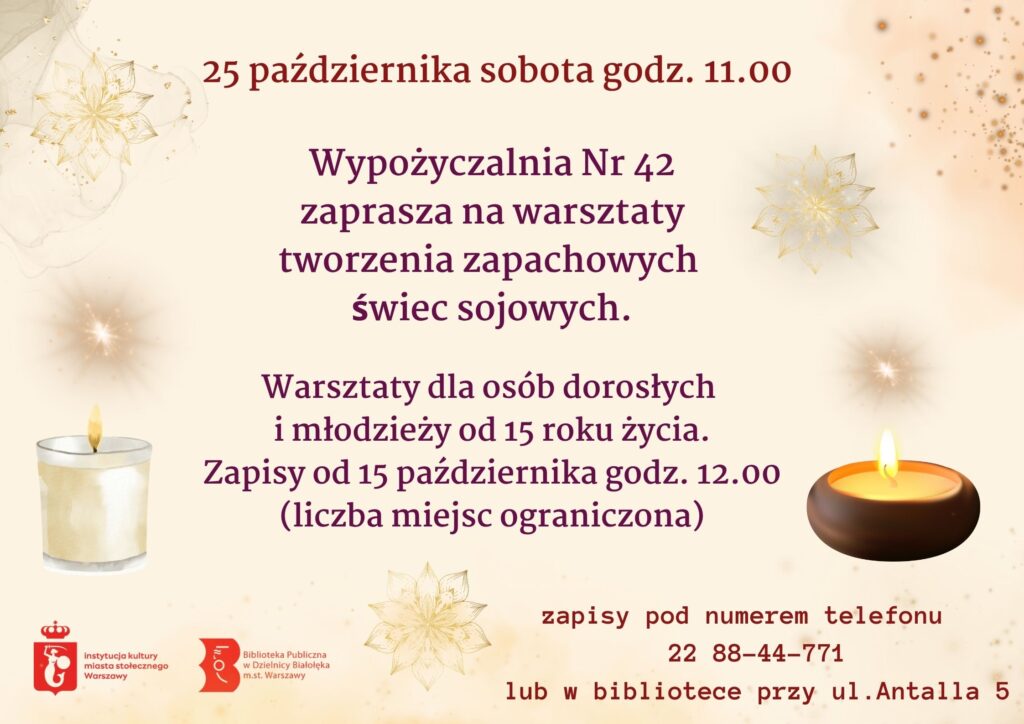 Wypożyczalnia nr 42 serdecznie zaprasza na Warsztaty tworzenia zapachowych świec sojowych 🕯️🕯️🕯️ które odbędą się 25 października (sobota) przy ul.Antalla 5.