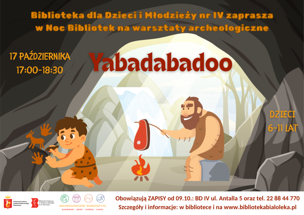 Serdecznie zapraszamy dzieci w wieku 6 –11 lat na warsztaty archeologiczne Yabadabadoo, podczas których przeniesiemy się do czasów jaskiniowców. Wspólnie rozpalimy pradziejowy ogień, stworzymy wydmuchiwane malowidła naskalne i użyjemy prehistorycznych, krzemiennych wiertarek! Będzie to wieczór pełen zabawy, kreatywności i odkryć – niczym prawdziwa podróż w czasie!
