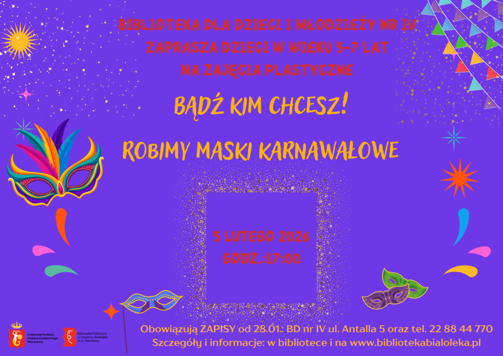 Biblioteka dla Dzieci i Młodzieży nr IV zaprasza dzieci w wieku 5-7 lat na zajęcia: Bądź kim chcesz! Robimy karnawałowe maski. W tym dniu nie zabraknie błysku, koloru oraz dobrej zabawy. Dołączcie i stwórzcie swoje balowe przebranie. Zajęcia odbędą się 5 lutego 2026 r. o godz.: 17:00  w BD IV na Antalla 5.