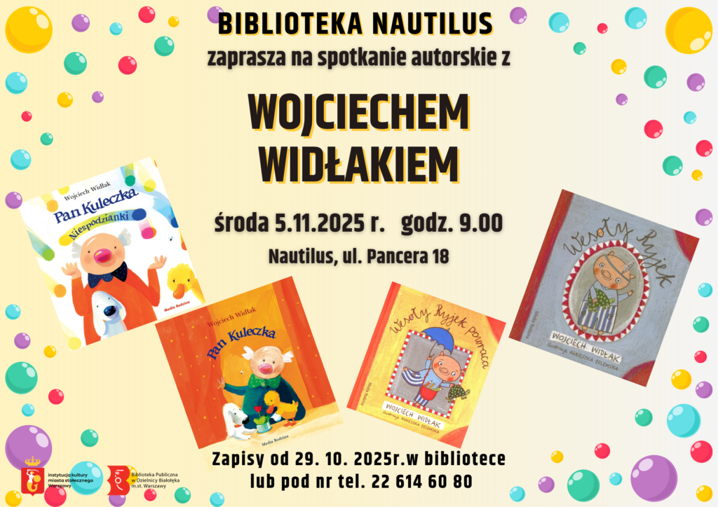 Zapraszamy do biblioteki Nautilus na spotkanie z wyjątkowym pisarzem. Wojciech Widłak jest autorem tworzącym książki dla dzieci – najbardziej znany jest ze swojej serii o Panu Kuleczce. W swoim dorobku Wojciech Widłak ma ponad czterdzieści książek, m.in. serie o Panu Kuleczce, Figlu i Psikusie (z ilustracjami Elżbiety Wasiuczyńskiej) oraz o Wesołym Ryjku (z ilustracjami Agnieszki Żelewskiej). Za swoją działalność literacką autor był wielokrotnie nagradzany i doceniany.
